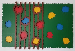 1995Kleuren en vormen quasi nonchalant over een vlak verdeeld.